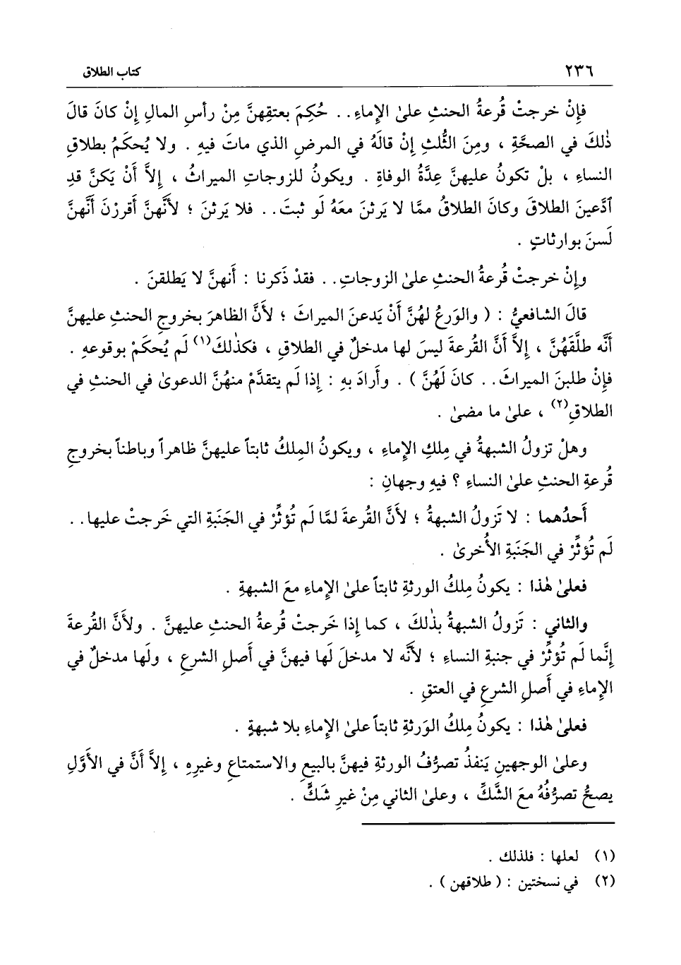 فإن خرجت قرعة الحنث على الإماء.. حكم بعتقهن من رأس المال إن كان قال ذلك في الصحة، ومن الثلث إن قاله في المرض الذي مات فيه. ولا يحكم بطلاق النساء، بل تكون عليهن عدة الوفاة. ويكون للزوجات الميراث، إلا أن يكن قد ادعين الطلاق وكان الطلاق مما لا يرثن معه لو ثبت.. فلا يرثن؛ لأنهن أقررن أنهن لسن بوارثات.