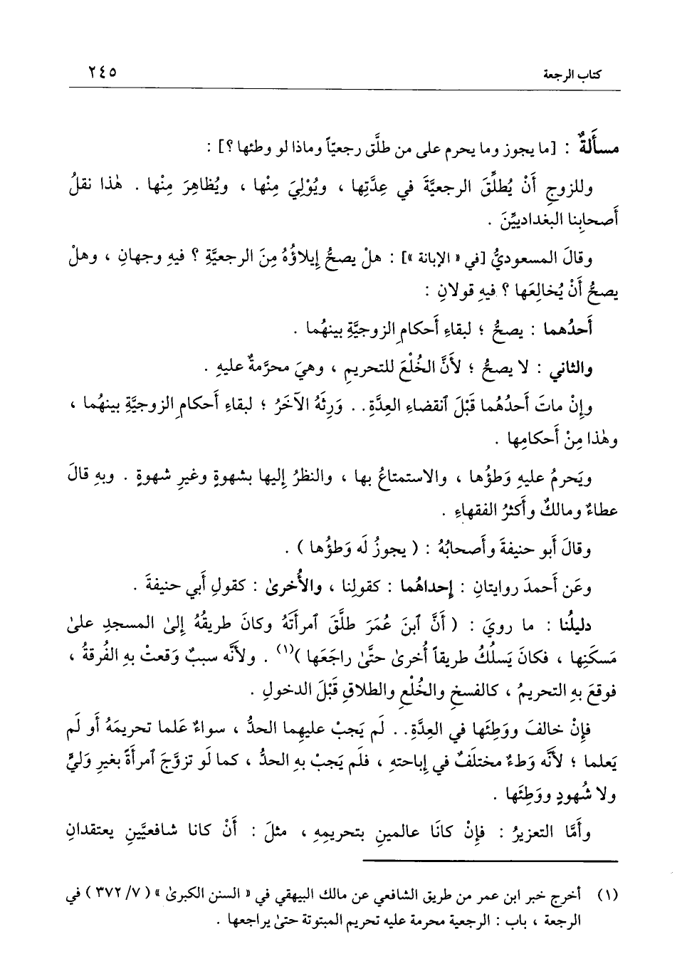 ؟] : وللزوج أن يطلق الرجعية في عدتها، ويولي منها، ويظاهر منها. هذا نقل أصحابنا البغداديين.