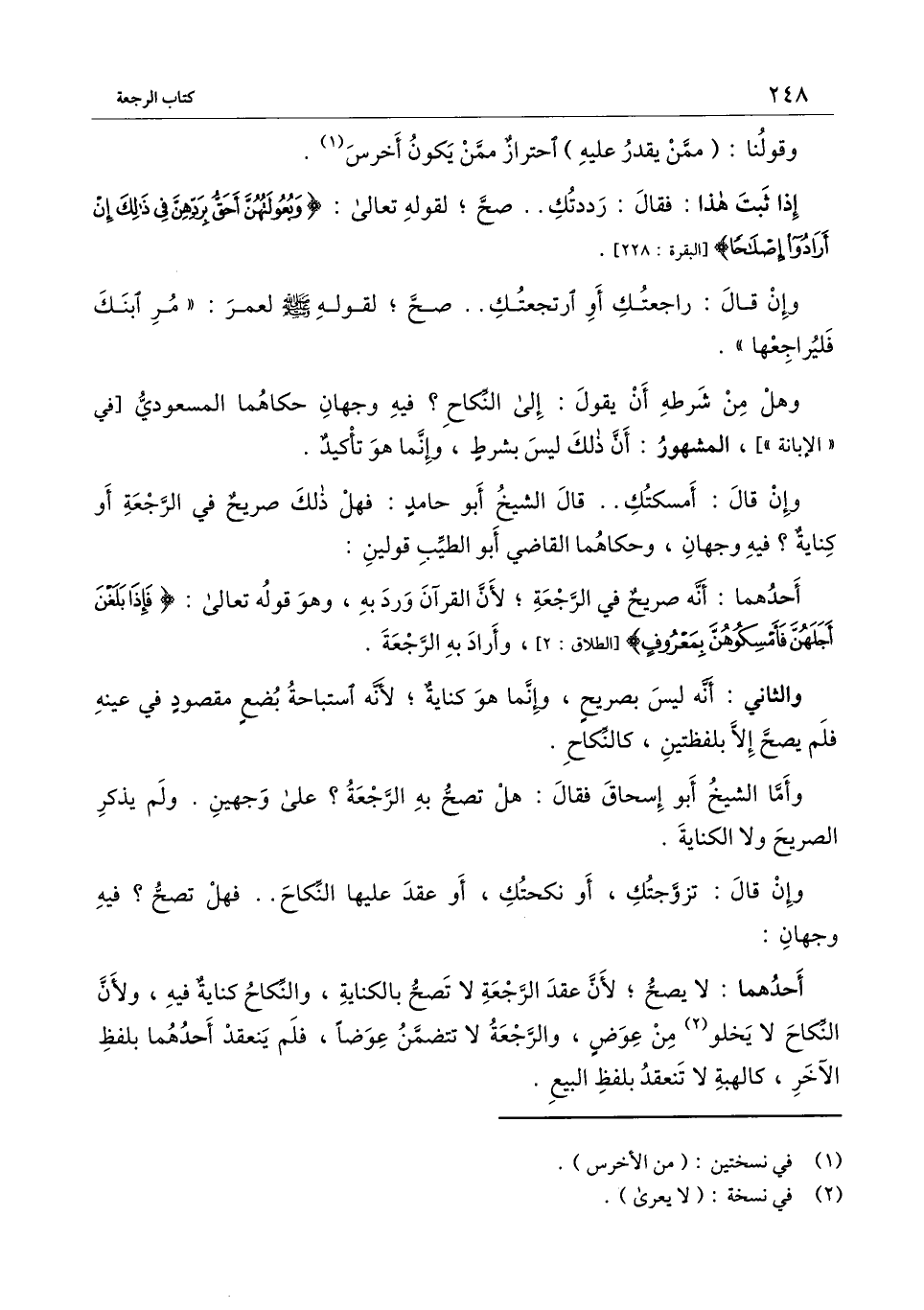 إذا ثبت هذا: فقال: رددتك.. صح؛ لِقَوْلِهِ تَعَالَى: {وَبُعُولَتُهُنَّ أَحَقُّ بِرَدِّهِنَّ فِي ذَلِكَ إِنْ أَرَادُوا إِصْلاحًا} [البقرة: 228] [البقرة: 228] .