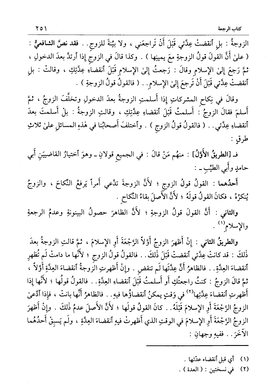 والطريق الثاني: إن أظهر الزوج الرجعة أو الإسلام، ثم قالت الزوجة بعد ذلك: قد كانت عدتي انقضت قبل ذلك.. فالقول قول الزوج؛ لأنها ما دامت لم تظهر انقضاء العدة.. فالظاهر أن عدتها لم تنقض. وإن أظهرت الزوجة انقضاء العدة أولا، ثم قال الزوج: كنت راجعتك أو أسلمت قبل انقضاء العدة.. فالقول قولها؛ لأنها إذا أظهرت انقضاء عدتها في وقت يمكن انقضاؤها فيه.. فالظاهر أنها بانت، فإذا ادعى الزوج الرجعة أو الإسلام قبله.. كان القول قولها؛ لأن الأصل عدم ذلك. وإن أظهر الزوج الرجعة أو الإسلام في الوقت الذي أظهرت فيه انقضاء العدة، ولم يسبق أحدهما الآخر.. ففيه وجهان: