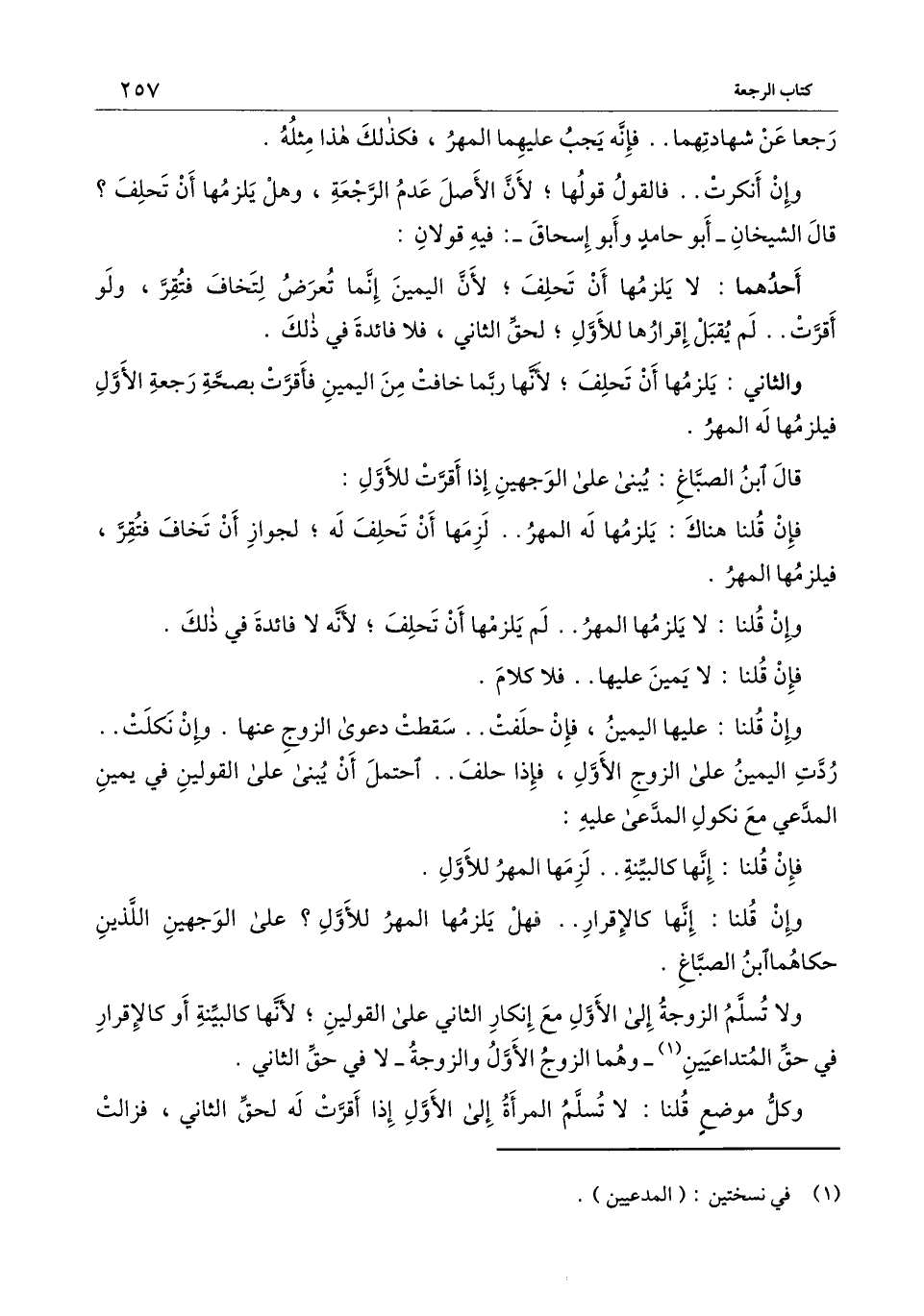 والثاني: يلزمها أن تحلف؛ لأنها ربما خافت من اليمين فأقرت بصحة رجعة الأول فيلزمها له المهر.