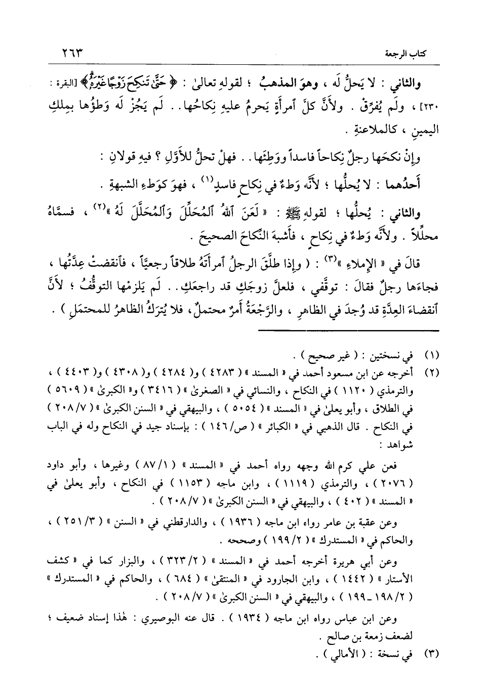 والثاني: لا يحل له، وهو المذهب؛ لِقَوْلِهِ تَعَالَى: {حَتَّى تَنْكِحَ زَوْجًا غَيْرَهُ} [البقرة: 230] [البقرة: 230] ، ولم يفرق. ولأن كل امرأة يحرم عليه نكاحها.. لم يجز له وطؤها بملك اليمين، كالملاعنة.