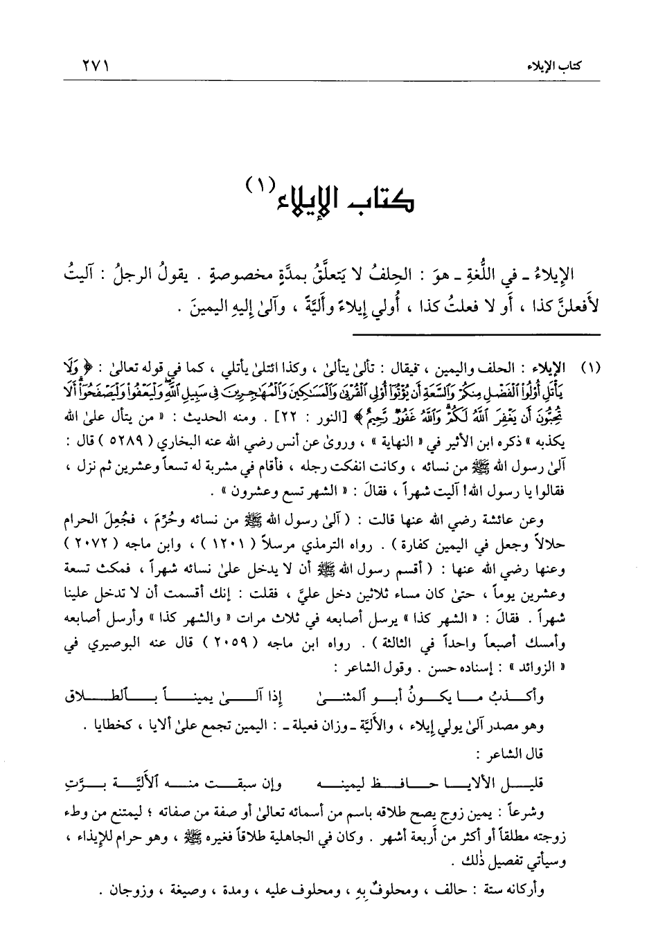كتاب الإيلاء الإيلاء - في اللغة - هو: الحلف لا يتعلق بمدة مخصوصة. يقول الرجل: آليت لأفعلن كذا، أو لا فعلت كذا، أولي إيلاء وألية، وآلى إليه اليمين.
