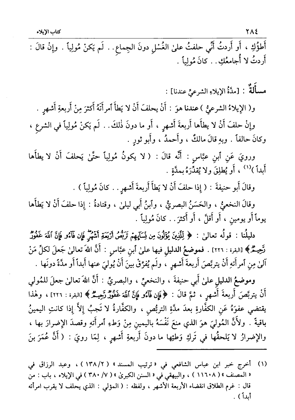 ] : و (الإيلاء الشرعي) عندنا هو: أن يحلف أن لا يطأ امرأته أكثر من أربعة أشهر.