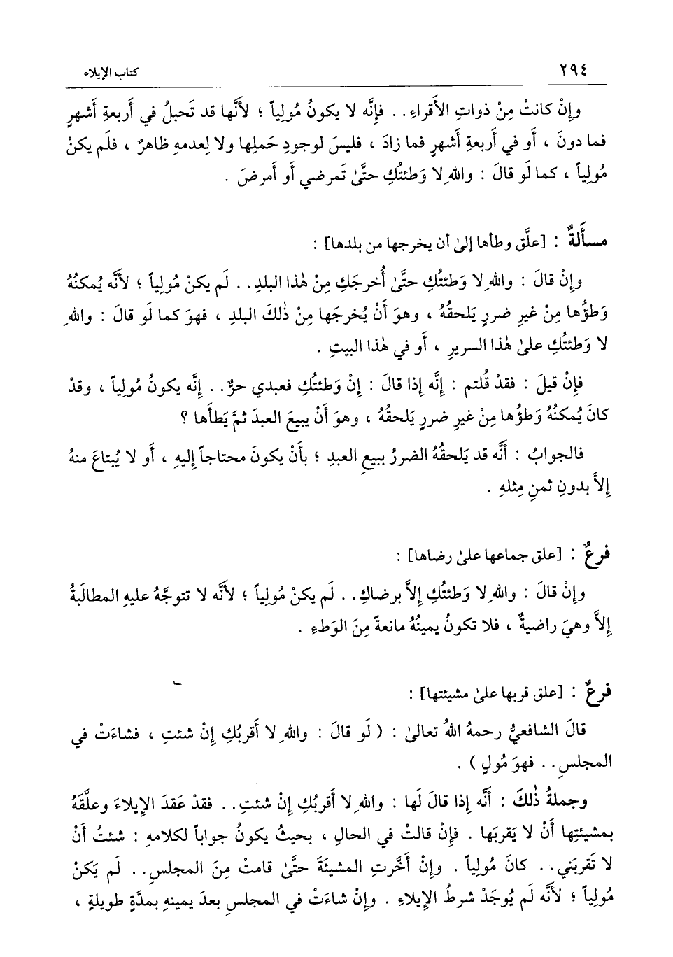 ] : وإن قال: والله لا وطئتك حتى أخرجك من هذا البلد.. لم يكن موليا؛ لأنه يمكنه وطؤها من غير ضرر يلحقه، وهو أن يخرجها من ذلك البلد، فهو كما لو قال: والله لا وطئتك على هذا السرير، أو في هذا البيت.