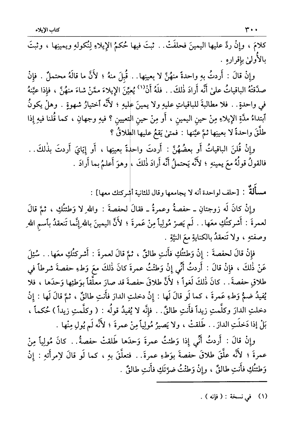 فإن قال لحفصة: إن وطئتك فأنت طالق، ثم قال لعمرة: أشركتك معها.. سئل عن ذلك، فإن قال: أردت أني إن وطئت عمرة كان ذلك مع وطء حفصة شرطا في طلاق حفصة.. كان ذلك لغوا؛ لأن طلاق حفصة قد صار معلقا بوطئها وحدها، فلا يفيد ضم وطء عمرة، كما لو قال لها: إن دخلت الدار فأنت طالق، ثم قال لها: إن دخلت الدار وكلمت زيدا فأنت طالق.. فإنه لا يفيد قوله: (وكلمت زيدا) حكما، بل إذا دخلت الدار.. طلقت، ولا يصير موليا من عمرة؛ لأنه لم يول منها.