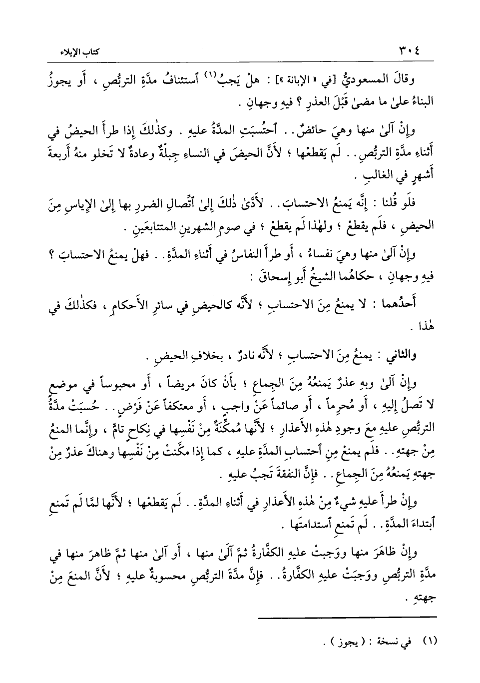 فلو قلنا: إنه يمنع الاحتساب.. لأدى ذلك إلى اتصال الضرر بها إلى الإياس من الحيض، فلم يقطع؛ ولهذا لم يقطع؛ في صوم الشهرين المتتابعين.