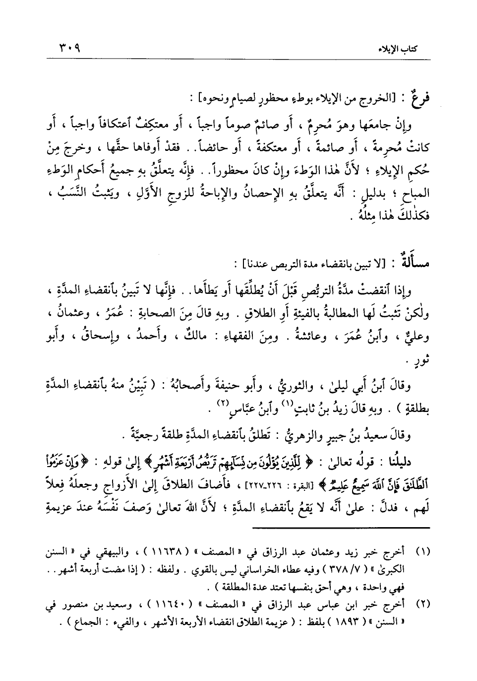 ] : وإذا انقضت مدة التربص قبل أن يطلقها أو يطأها.. فإنها لا تبين بانقضاء المدة، ولكن تثبت لها المطالبة بالفيئة أو الطلاق. وبه قال من الصحابة: عمر وعثمان وعلي وابن عمر وعائشة، ومن الفقهاء: مالك وأحمد وإسحاق وأبو ثور.