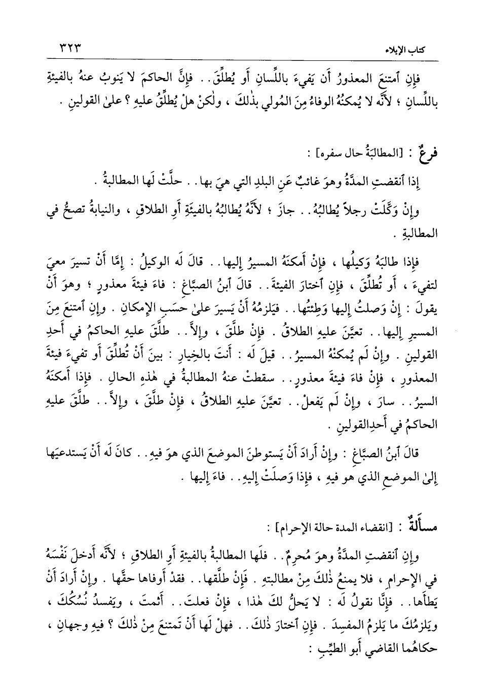 مسألة: [انقضاء المدة حالة الإحرام] : وإن انقضت المدة وهو محرم.. فلها المطالبة بالفيئة أو الطلاق؛ لأنه أدخل نفسه في الإحرام، فلا يمنع ذلك من مطالبته. فإن طلقها.. فقد أوفاها حقها. وإن أراد أن يطأها.. فإنا نقول له: لا يحل لك هذا، فإن فعلت.. أثمت، ويفسد نسكك، ويلزمك ما يلزم المفسد. فإن اختار ذلك.. فهل لها أن تمتنع من ذلك؟ فيه وجهان حكاهما القاضي أبو الطيب:
