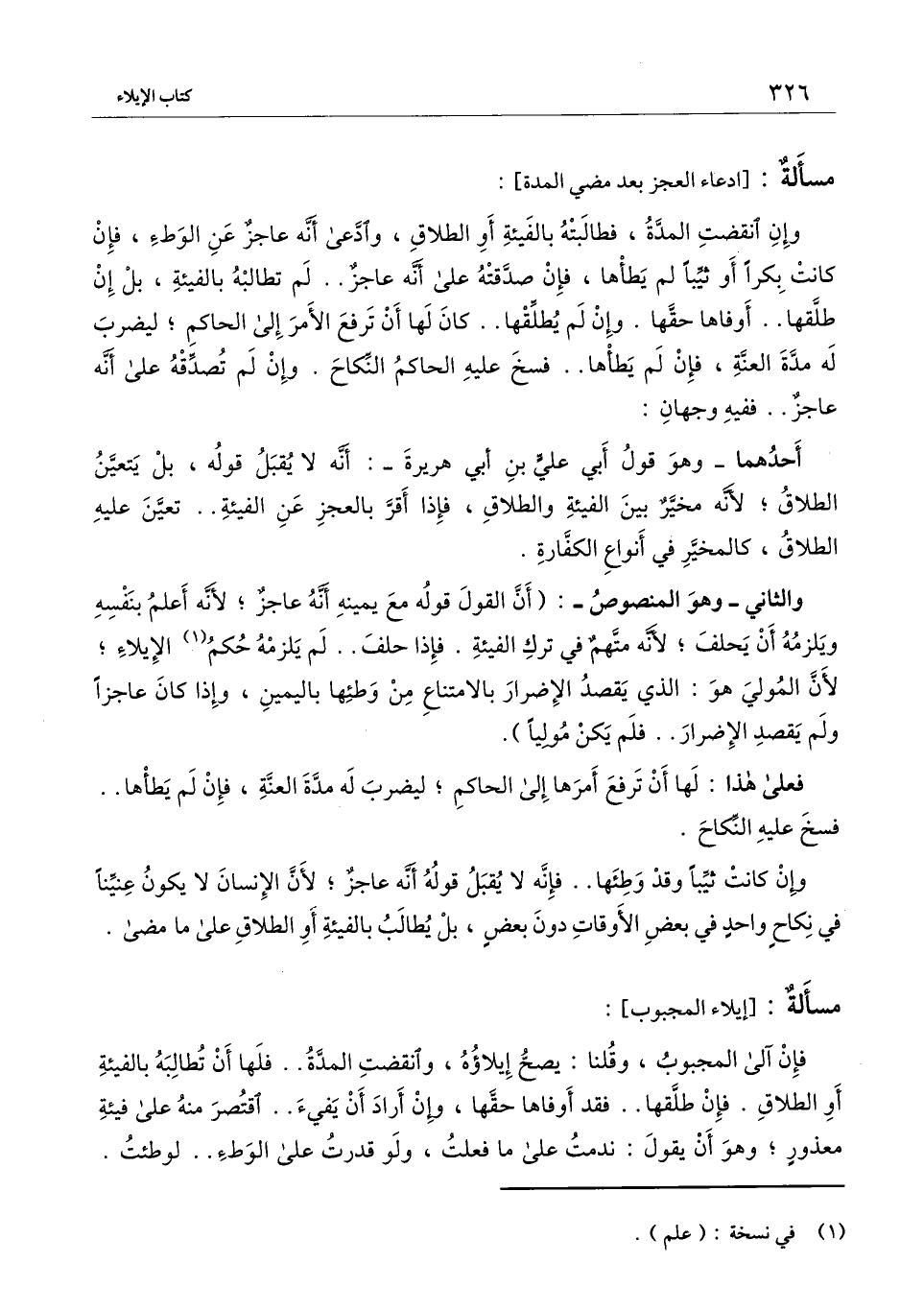 ] : وإن انقضت المدة، فطالبته بالفيئة أو الطلاق، وادعى أنه عاجز عن الوطء، فإن كانت بكرا أو ثيبا لم يطأها، فإن صدقته على أنه عاجز.. لم تطالبه بالفيئة، بل إن طلقها.. أوفاها حقها. وإن لم يطلقها.. كان لها أن ترفع الأمر إلى الحاكم ليضرب له مدة العنة، فإن لم يطأها.. فسخ عليه الحاكم النكاح. وإن لم تصدقه على أنه عاجز.. ففيه وجهان: