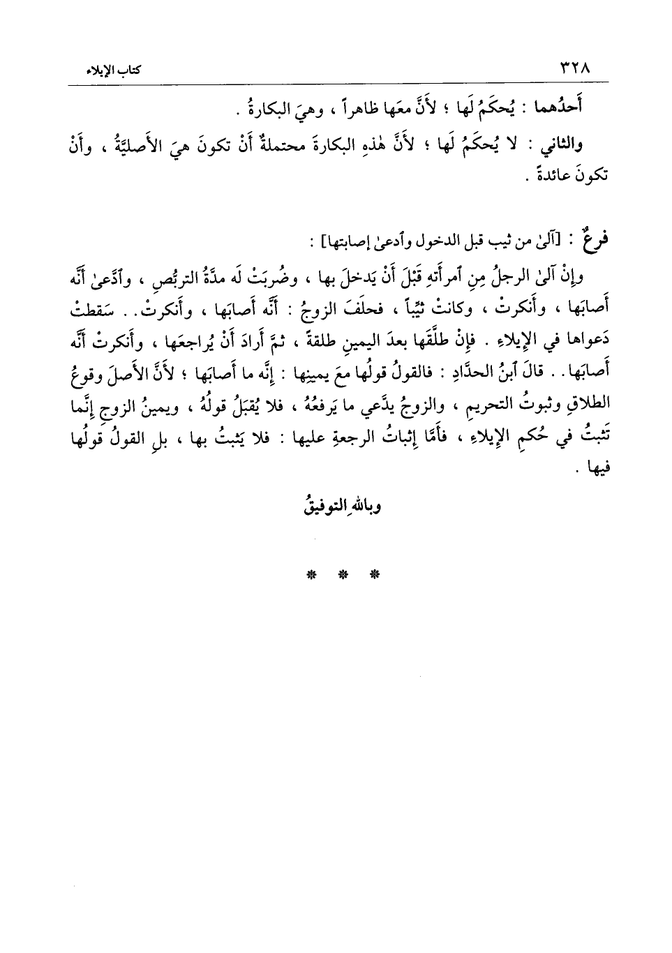 ] : وإن آلى الرجل من امرأته قبل أن يدخل بها، وضربت له مدة التربص، وادعى أنه أصابها، وأنكرت، وكانت ثيبا، فحلف الزوج: أنه أصابها، وأنكرت.. سقطت دعواها في الإيلاء. فإن طلقها بعد اليمين طلقة، ثم أراد أن يراجعها، وأنكرت أنه أصابها.. قال ابن الحداد: فالقول قولها مع يمينها: إنه ما أصابها؛ لأن الأصل وقوع الطلاق وثبوت التحريم، والزوج يدعي ما يرفعه، فلا يقبل قوله، ويمين الزوج إنما تثبت في حكم الإيلاء، فأما إثبات الرجعة عليها: فلا يثبت بها، بل القول قولها فيها.