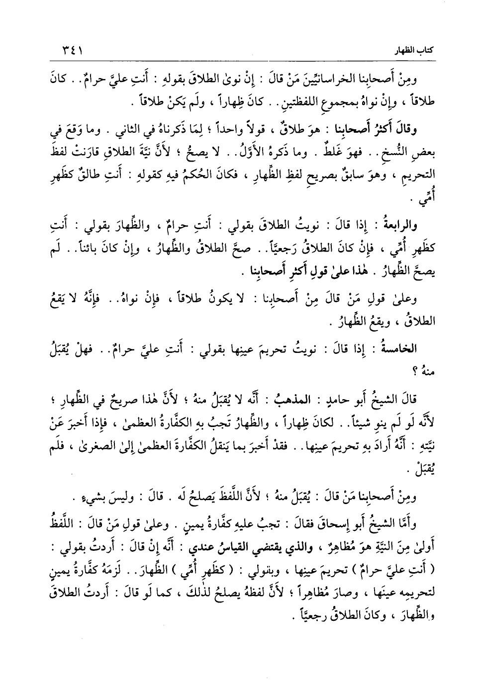 والرابعة: إذا قال: نويت الطلاق بقولي: أنت حرام، والظهار بقولي: أنت كظهر أمي، فإن كان الطلاق رجعيا.. صح الطلاق والظهار، وإن كان بائنا.. لم يصح الظهار. هذا على قول أكثر أصحابنا. وعلى قول من قال من أصحابنا: لا يكون طلاقا، فإن نواه.. فإنه لا يقع الطلاق، ويقع الظهار.