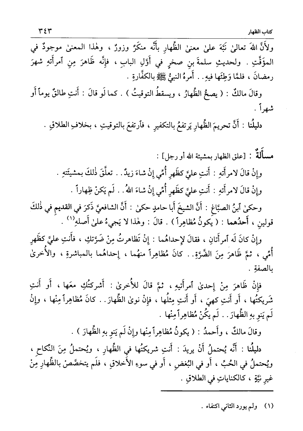 وحكى ابن الصباغ: أن الشيخ أبا حامد حكى: أن الشافعي ذكر في القديم في ذلك قولين، أحدهما: (يكون مظاهرا) . قال: وهذا لا يجيء على أصله.