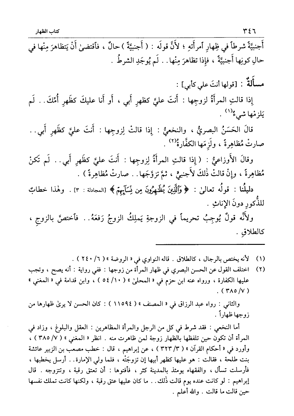 قال الحسن البصري والنخعي: إذا قالت لزوجها: أنت علي كظهر أبي.. صارت مظاهرة، ولزمها الكفارة.