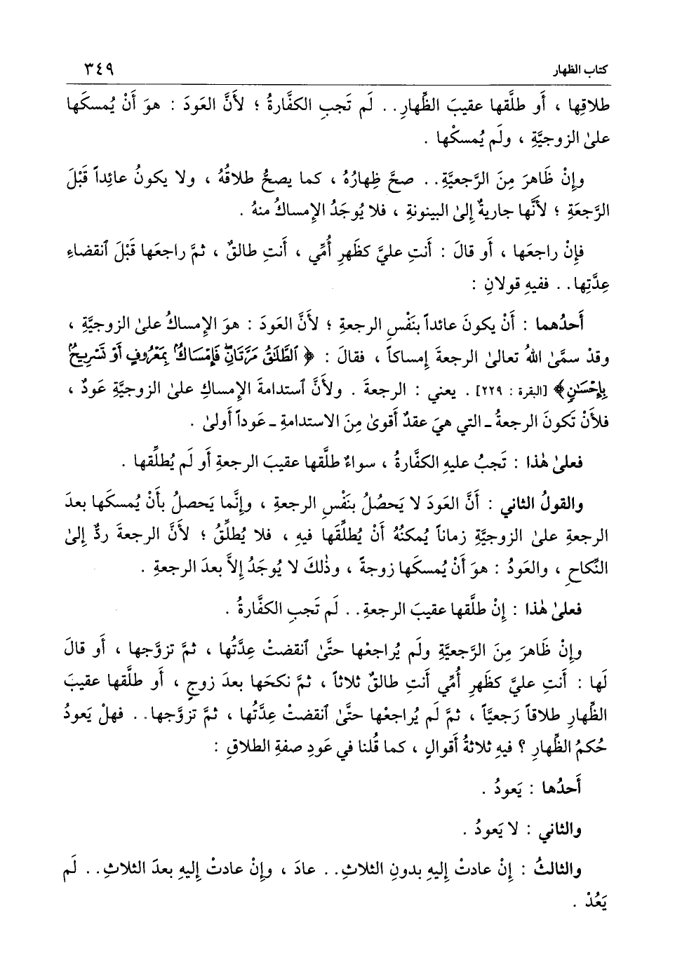 أحدهما: أن يكون عائدا بنفس الرجعة؛ لأن العود: هو الإمساك على الزوجية، وقد سمى الله تعالى الرجعة إمساكا، فقال: {الطَّلاقُ مَرَّتَانِ فَإِمْسَاكٌ بِمَعْرُوفٍ أَوْ تَسْرِيحٌ بِإِحْسَانٍ} [البقرة: 229] [البقرة: 229] . يعني: الرجعة. ولأن استدامة الإمساك على الزوجية عود، فلأن تكون الرجعة - التي هي عقد أقوى من الاستدامة - عودا أولى.