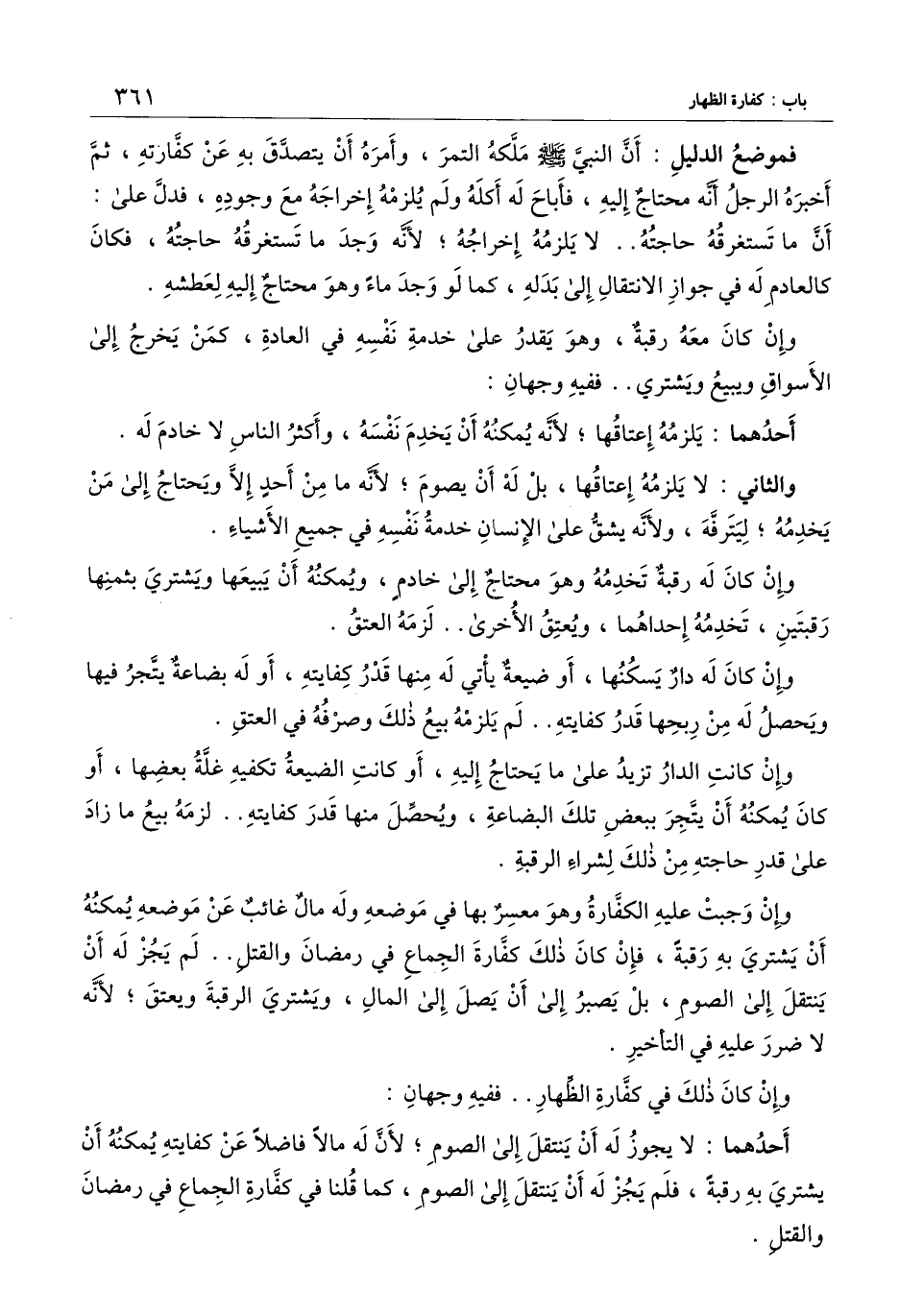 فموضع الدليل: أن النبي - صَلَّى اللَّهُ عَلَيْهِ وَسَلَّمَ - ملكه التمر، وأمره أن يتصدق به عن كفارته، ثم أخبره الرجل أنه محتاج إليه، فأباح له أكله ولم يلزمه إخراجه مع وجوده، فدل على أن ما تستغرقه حاجته.. لا يلزمه إخراجه؛ لأنه وجد ما تستغرقه حاجته، فكان كالعادم له في جواز الانتقال إلى بدله، كما لو وجد ماء وهو محتاج إليه لعطشه.