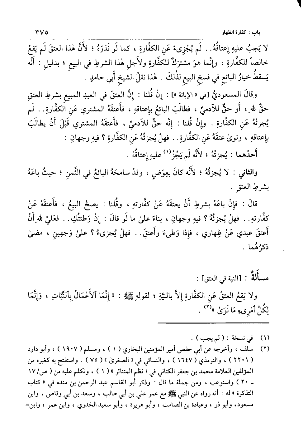 ] : ولا يقع العتق عن الكفارة إلا بالنية؛ لقوله - صَلَّى اللَّهُ عَلَيْهِ وَسَلَّمَ -: «إنما الأعمال بالنيات، وإنما لكل امرئ ما نوى» .