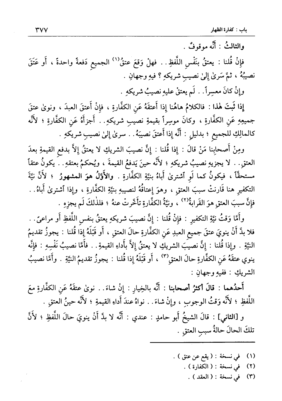 ومن أصحابنا من قال: إذا قلنا: إن نصيب الشريك لا يعتق إلا بدفع القيمة بعد العتق.. لا يجزيه نصيب شريكه؛ لأنه حين يدفع القيمة، ويحكم بعتقه.. يكون عتقا مستحقا، فيكون كما لو اشترى أباه بنية الكفارة. والأول هو المشهور؛ لأن نية التكفير هنا قارنت سبب العتق، وهو إعتاقه لنصيبه بنية الكفارة، وإذا اشترى أباه.. فإن سبب العتق هو القرابة، ونية الكفارة تأخرت عنه؛ فلذلك لم يجزه.
