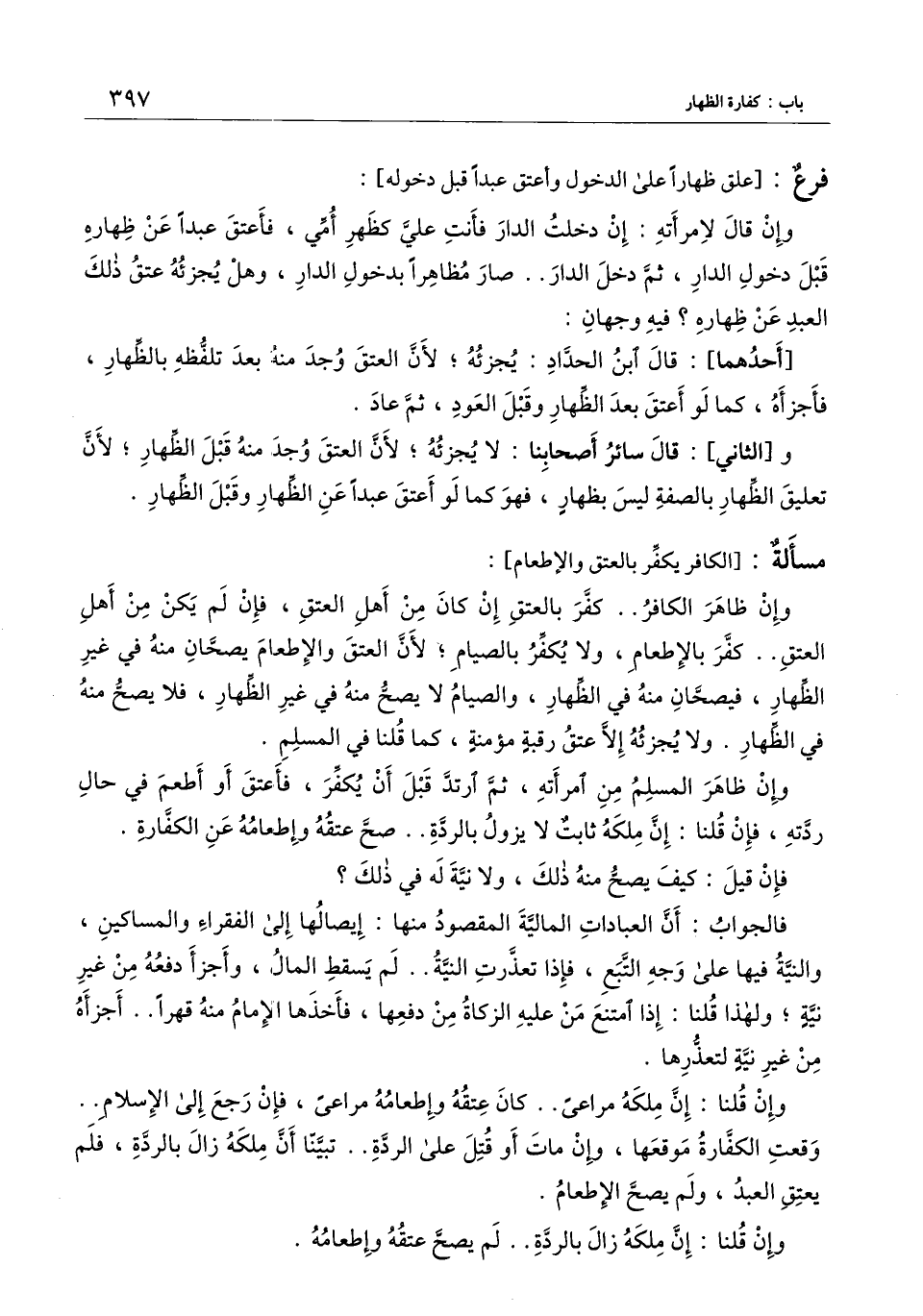 وإن ظاهر الكافر.. كفر بالعتق إن كان من أهل العتق، فإن لم يكن من أهل العتق.. كفر بالإطعام، ولا يكفر بالصيام؛ لأن العتق والإطعام يصحان منه في غير الظهار، فيصحان منه في الظهار، والصيام لا يصح منه في غير الظهار، فلا يصح منه في الظهار. ولا يجزئه إلا عتق رقبة مؤمنة، كما قلنا في المسلم.