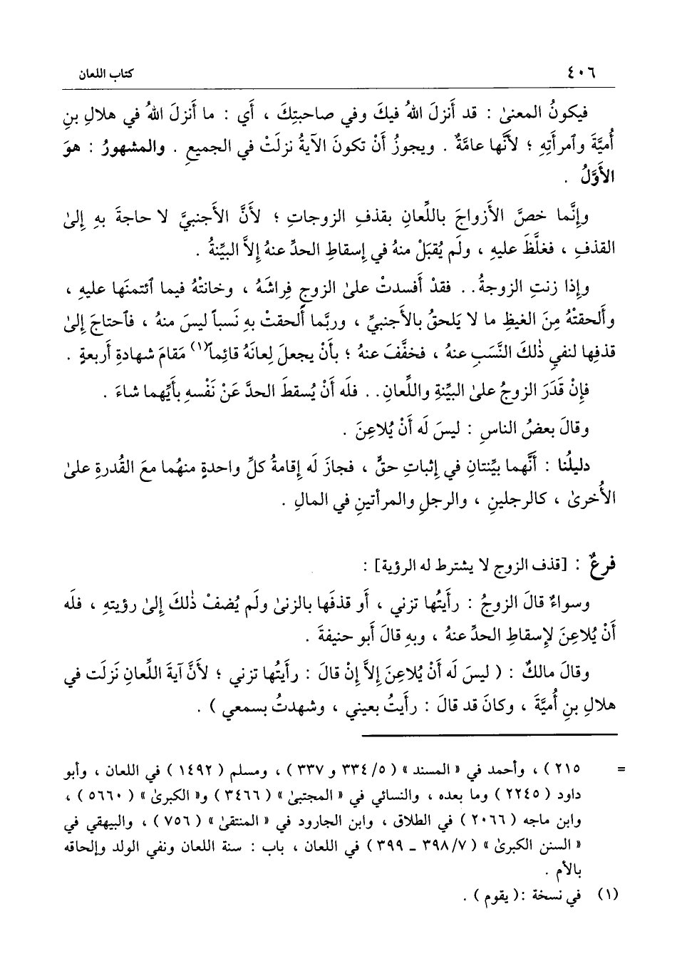 ] : وسواء قال الزوج: رأيتها تزني، أو قذفها بالزنى ولم يضف ذلك إلى رؤيته، فله أن يلاعن لإسقاط الحد عنه، وبه قال أبو حنيفة.