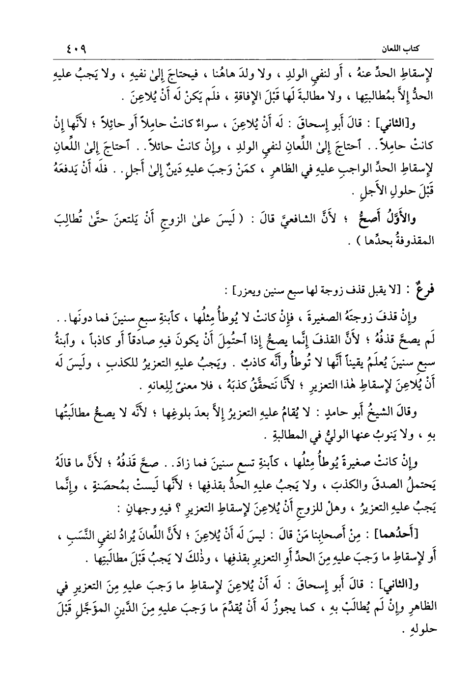 و [الثاني] : قال أبو إسحاق: له أن يلاعن، سواء كانت حاملا أو حائلا؛ لأنها إن كانت حاملا.. احتاج إلى اللعان لنفي الولد، وإن كانت حائلا.. احتاج إلى اللعان لإسقاط الحد الواجب عليه في الظاهر، كمن وجب عليه دين إلى أجل.. فله أن يدفعه قبل حلول الأجل.