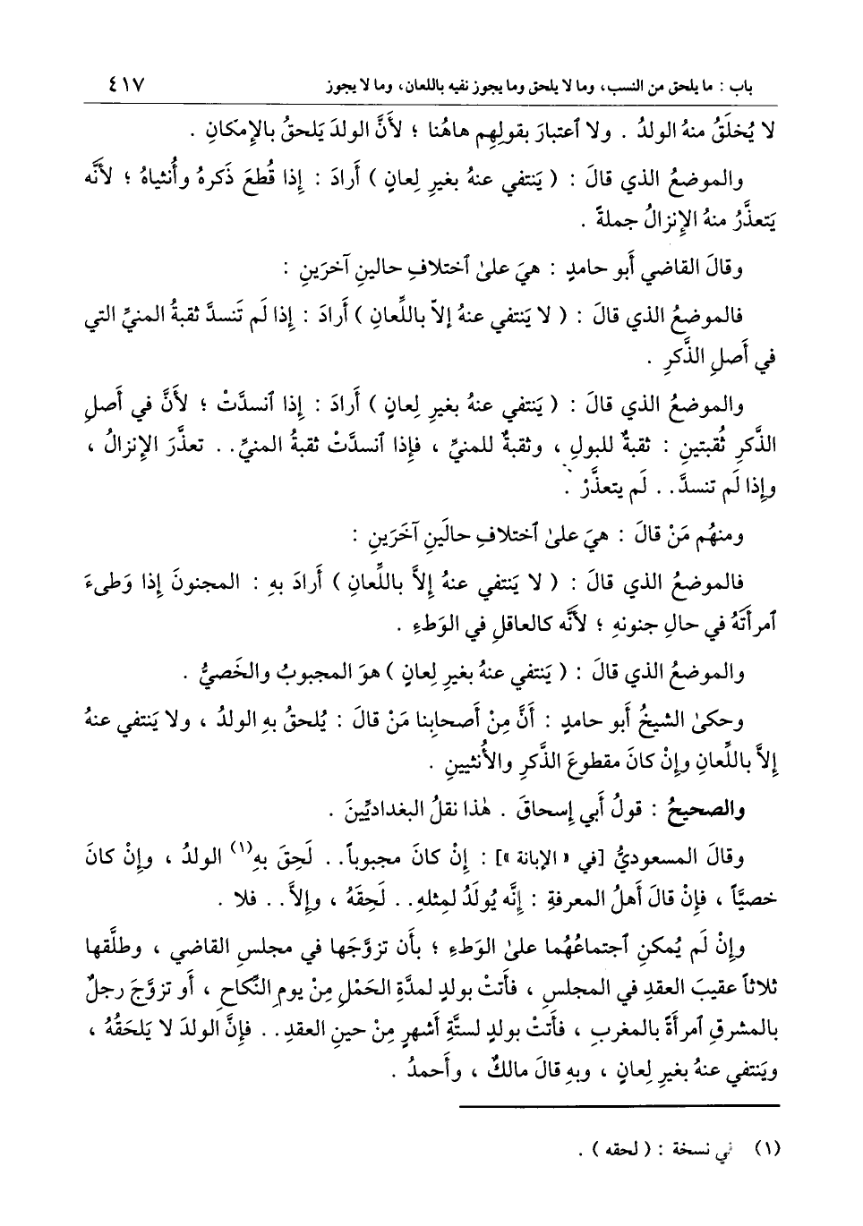 فالموضع الذي قال: (لا ينتفي عنه إلا باللعان) أراد به: المجنون إذا وطئ امرأته في حال جنونه؛ لأنه كالعاقل في الوطء.