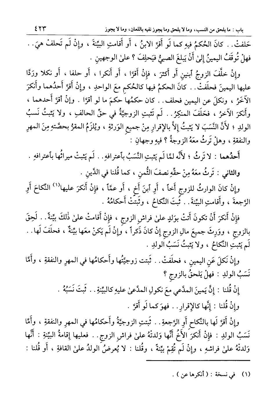 وإن نكل عن اليمين، فحلفت.. ثبتت زوجيتها وأحكامها في المهر والنفقة، وأما نسب الولد: فهل يلحق بالزوج؟