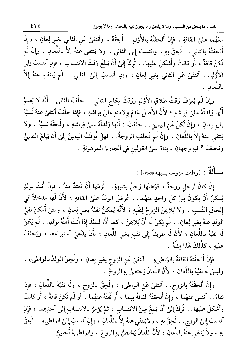 ] إن كانت لرجل زوجة، فوطئها رجل بشبهة.. لزمها أن تعتد منه، فإن أتت بولد يمكن أن يكون من كل واحد منهما.. عرض الولد على القافة؛ لأن لها مدخلا في إلحاق النسب، ولا يلاعن الزوج لنفيه؛ لأنه يمكن نفيه بغير لعان، ومتى أمكن نفي الولد عنه بغير لعان.. لم يكن له أن يلاعن، كما أن السيد إذا أتت أمته بولد.. لم يكن له نفيه باللعان؛ لأن له طريقا إلى نفيه بغير اللعان، بأن يدعي استبراءها، ويحلف عليه، كذلك هذا مثله.