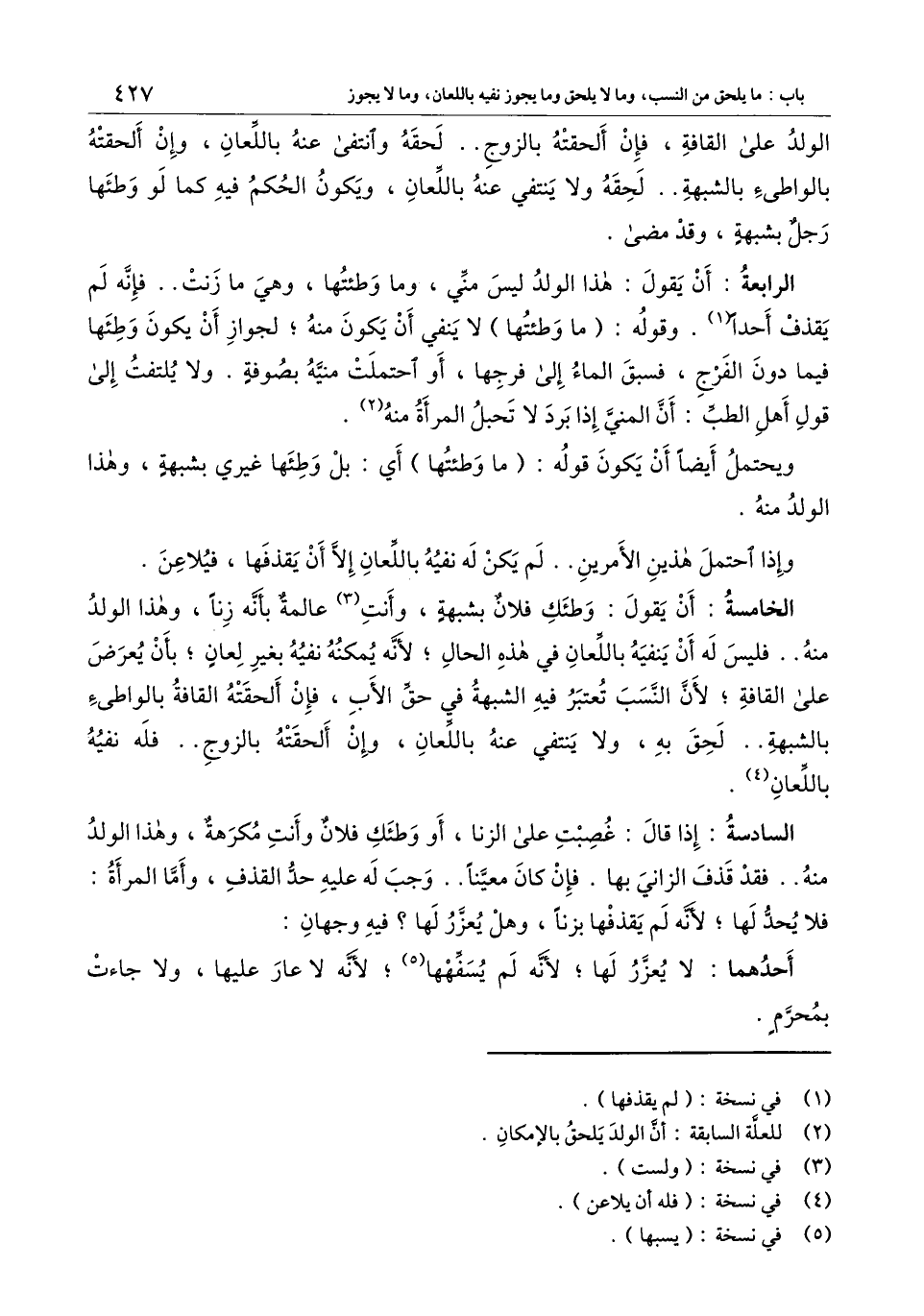 الخامسة: أن يقول: وطئك فلان بشبهة، وأنت عالمة بأنه زنا، وهذا الولد منه.. فليس له أن ينفيه باللعان في هذه الحال؛ لأنه يمكنه نفيه بغير لعان؛ بأن يعرض على القافة؛ لأن النسب تعتبر فيه الشبهة في حق الأب، فإن ألحقته القافة بالواطئ بالشبهة.. لحق به، ولا ينتفي عنه باللعان، وإن ألحقته بالزوج.. فله نفيه باللعان.