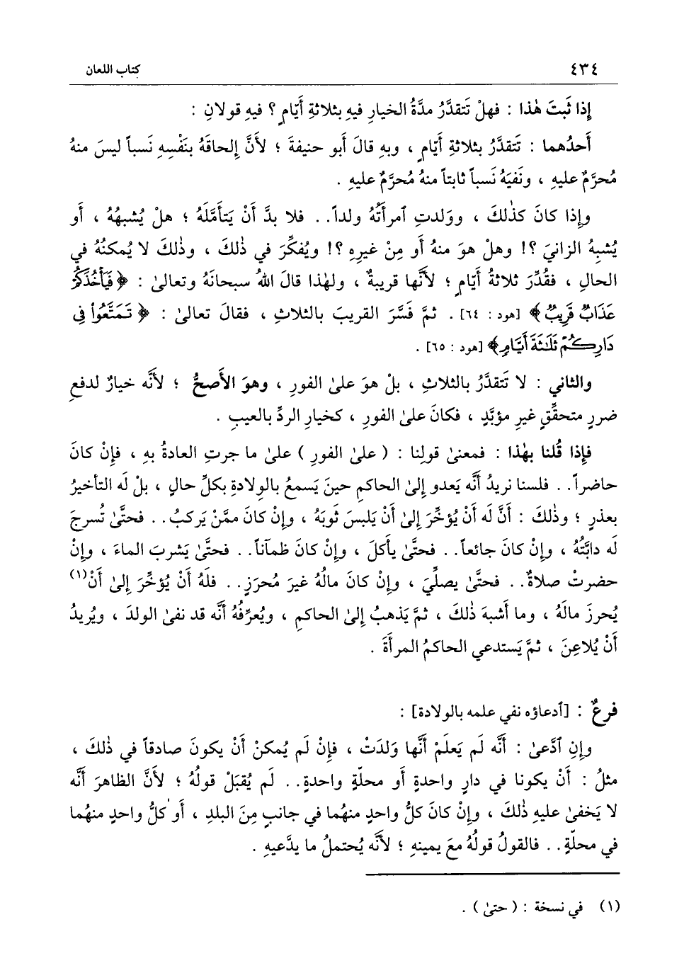 وإذا كان كذلك، وولدت امرأته ولدا.. فلا بد أن يتأمله؛ هل يشبهه، أو يشبه الزاني؟! وهل هو منه أو من غيره؟! ويفكر في ذلك، وذلك لا يمكنه في الحال، فقدر ثلاثة أيام؛ لأنها قريبة، ولهذا قال الله سبحانه وتعالى: {فَيَأْخُذَكُمْ عَذَابٌ قَرِيبٌ} [هود: 64] [هود: 64] . ثم فسر القريب بالثلاث، فقال تعالى: {تَمَتَّعُوا فِي دَارِكُمْ ثَلاثَةَ أَيَّامٍ} [هود: 65] [هود: 65] .