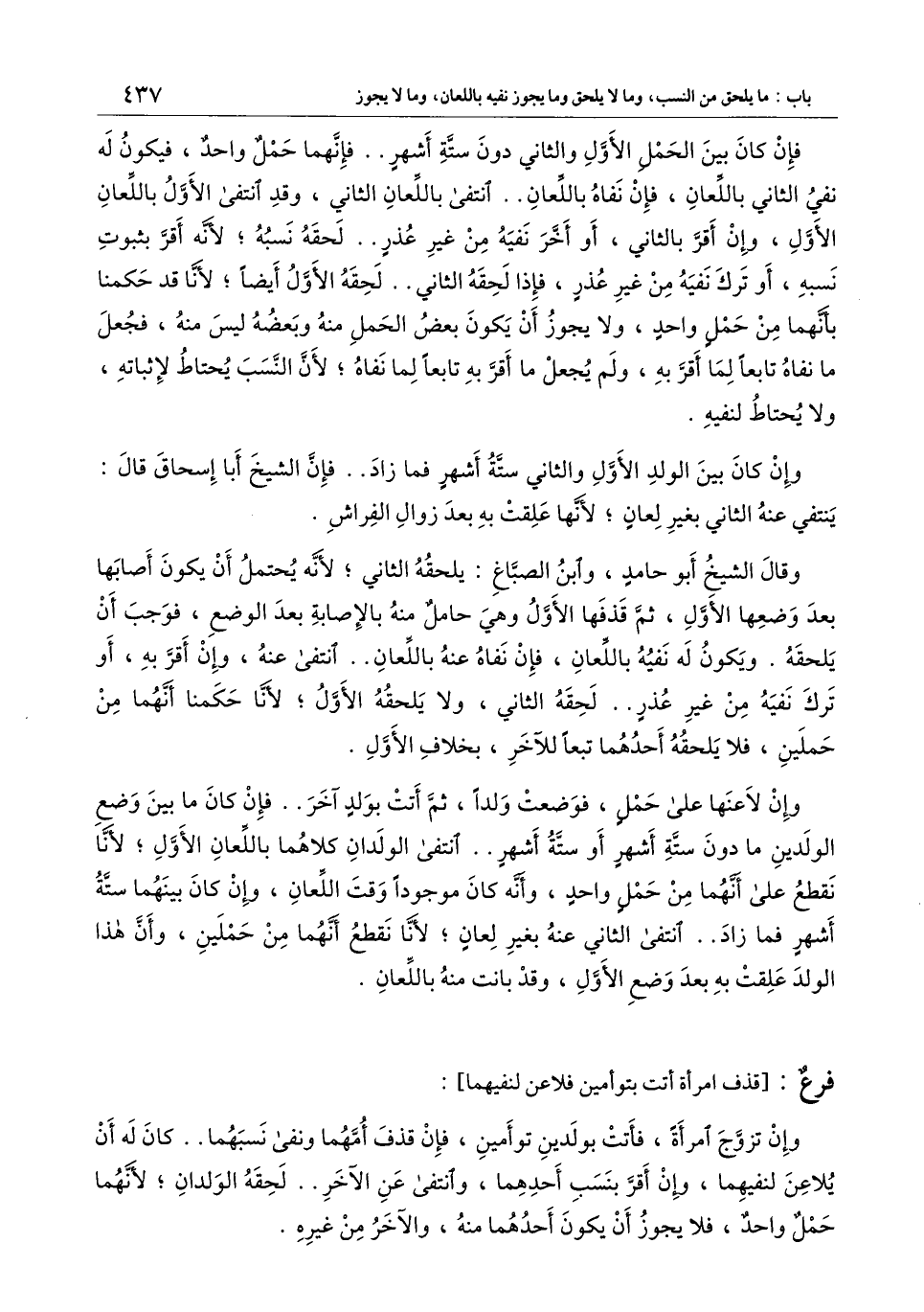 فإن كان بين الحمل الأول والثاني دون ستة أشهر.. فإنهما حمل واحد، فيكون له نفي الثاني باللعان، فإن نفاه باللعان.. انتفى باللعان الثاني، وقد انتفى الأول باللعان الأول، وإن أقر بالثاني، أو أخر نفيه من غير عذر.. لحقه نسبه؛ لأنه أقر بثبوت نسبه، أو ترك نفيه من غير عذر، فإذا لحقه الثاني.. لحقه الأول أيضا؛ لأنا قد حكمنا بأنهما من حمل واحد، ولا يجوز أن يكون بعض الحمل منه وبعضه ليس منه، فجعل ما نفاه لما أقر به، ولم يجعل ما أقر به تابعا لما نفاه؛ لأن النسب يحتاط لإثباته، ولا يحتاط لنفيه.
