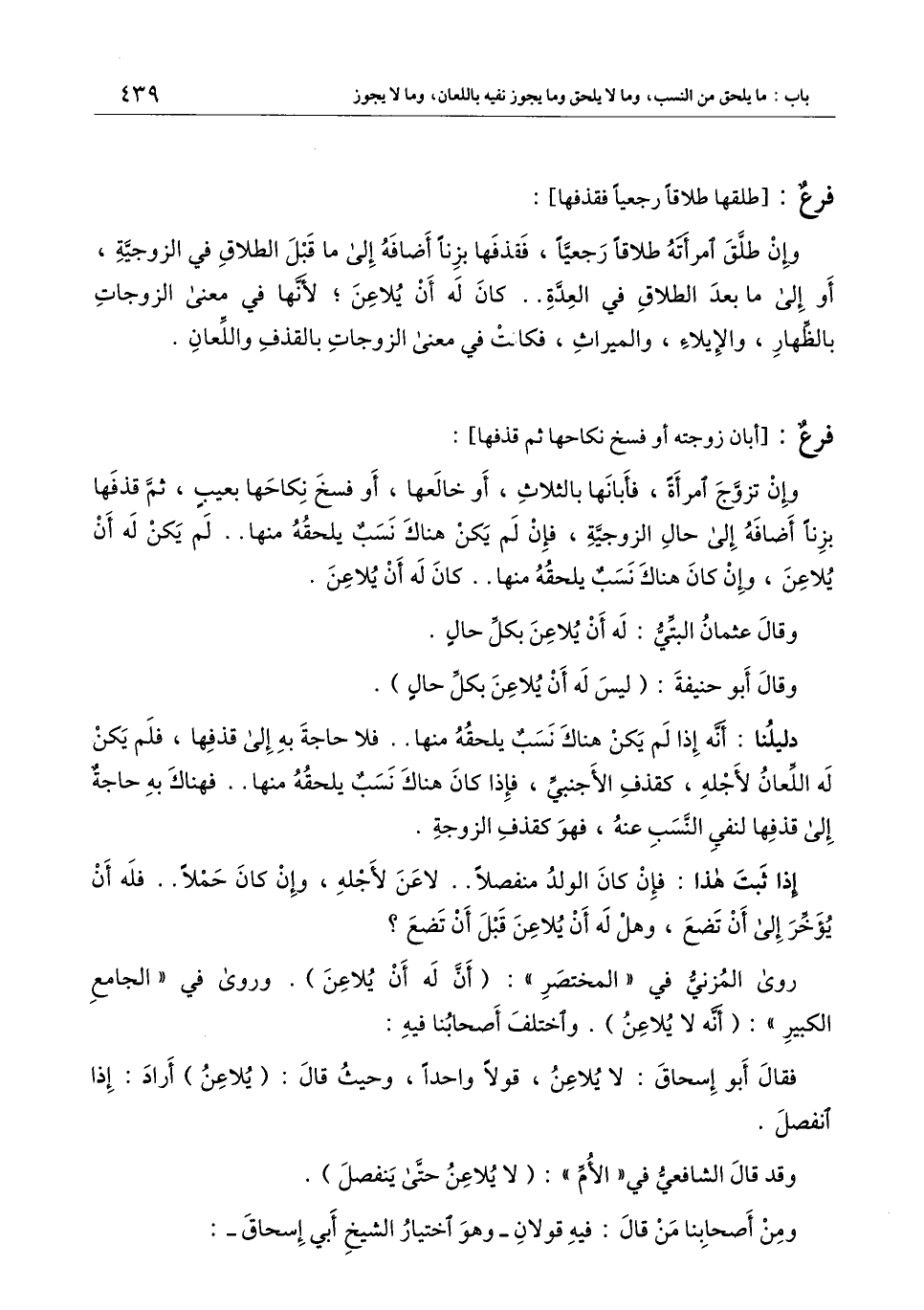 ] : وإن تزوج امرأة فأبانها بالثلاث، أو خالعها، أو فسخ نكاحها بعيب، ثم قذفها بزنا أضافه إلى حال الزوجية، فإن لم يكن هناك نسب يلحقه منها.. لم يكن له أن يلاعن، وإن كان هناك نسب يلحقه منها.. كان له أن يلاعن.