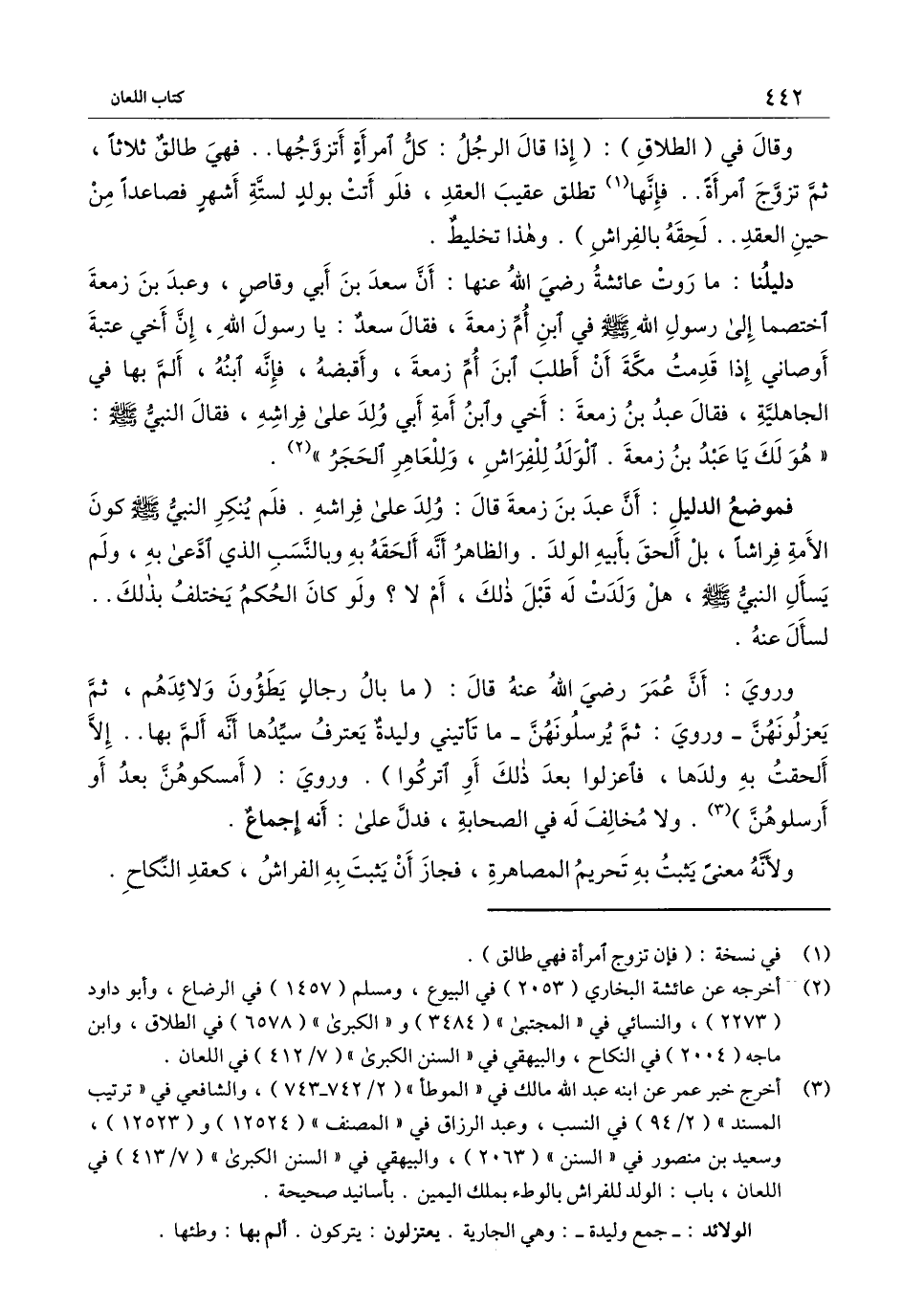 فموضع الدليل: أن عبد بن زمعة قال: ولد على فراشه. فلم ينكر النبي - صَلَّى اللَّهُ عَلَيْهِ وَسَلَّمَ - كون الأمة فراشا، بل ألحق بأبيه الولد. والظاهر أنه ألحقه به وبالنسب الذي ادعى به، ولم يسأل النبي - صَلَّى اللَّهُ عَلَيْهِ وَسَلَّمَ -، هل ولدت له قبل ذلك، أم لا؟ ولو كان الحكم يختلف بذلك.. لسأل عنه.