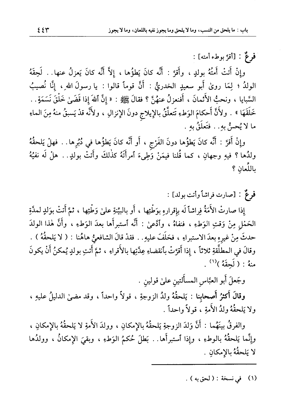] : وإن أتت أمته بولد، وأقر: أنه كان يطؤها، إلا أنه كان يعزل عنها.. لحقه الولد؛ لما روى أبو سعيد الخدري: «أن قوما قالوا: يا رسول الله، إنا نصيب السبايا، ونحب الأثمان، أفنعزل عنهن؟ فقال - صَلَّى اللَّهُ عَلَيْهِ وَسَلَّمَ -: " إن الله إذا قضى خلق نسمة.. خلقها» . ولأن أحكام الوطء تتعلق بالإيلاج دون الإنزال، ولأنه قد يسبق منه من الماء ما لا يحسن به.. فتعلق به.