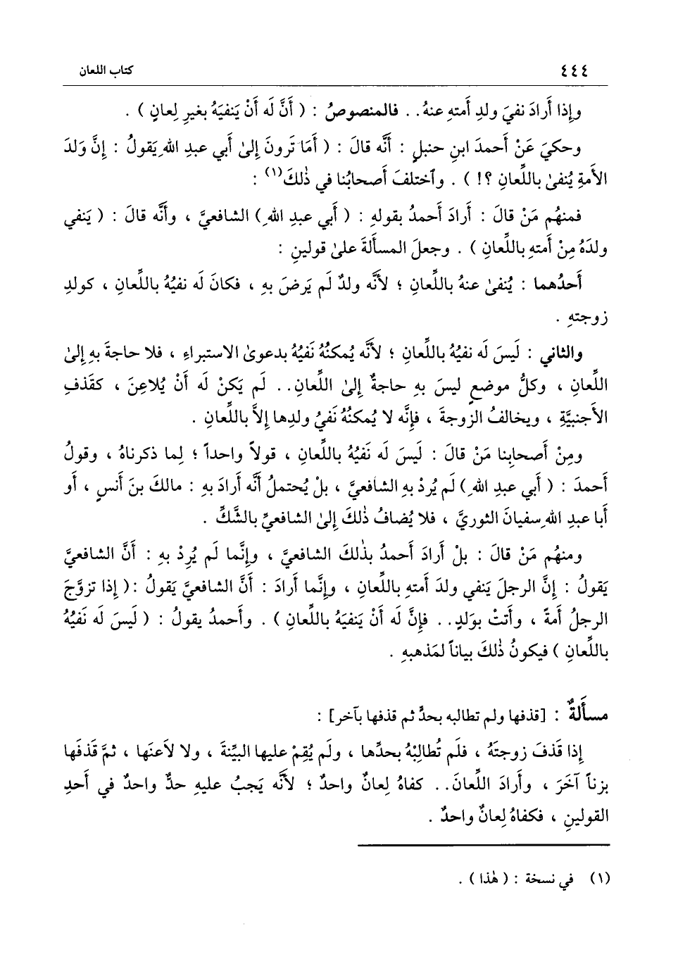 ومن أصحابنا من قال: ليس له نفيه باللعان، قولا واحدا؛ لما ذكرناه، وقول أحمد: (أبي عبد الله) لم يرد به الشافعي، بل يحتمل أنه أراد به: مالك بن أنس، أو أبا عبد الله سفيان الثوري، فلا يضاف ذلك إلى الشافعي بالشك.