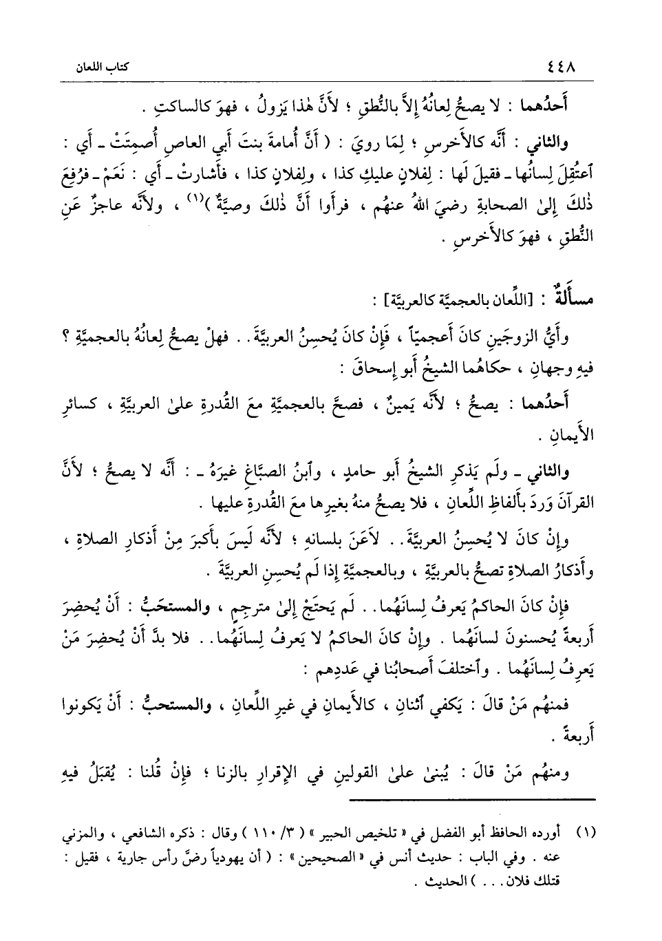 كالعربية] : وأي الزوجين كان أعجميا، فإن كان يحسن العربية.. فهل يصح لعانه بالعجمية؟ فيه وجهان، حكاهما الشيخ أبو إسحاق: