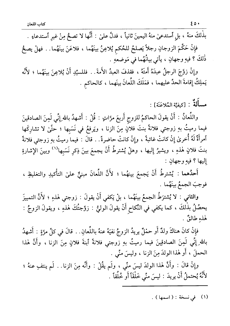 ] : واللعان: أن يقول الحاكم للزوج أربع مرات: قل: أشهد بالله إني لمن الصادقين فيما رميت به زوجتي فلانة بنت فلان من الزنا، ويرفع في نسبها؛ حتى لا تشاركها امرأة له أخرى إن كانت غائبة، وإن كانت حاضرة.. قال: فيما رميت به زوجتي فلانة بنت فلان هذه، ويشير إليها، وهل يشترط أن يجمع بين ذكر نسبها وبين الإشارة إليها؟ فيه وجهان: