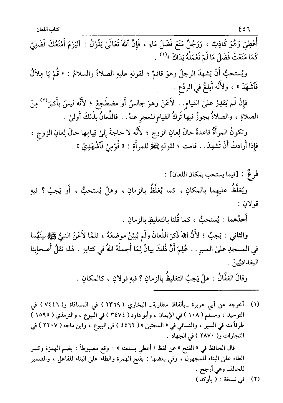 والثاني: يجب؛ لأن الله ذكر اللعان ولم يبين موضعه، فلما لاعن النبي - صَلَّى اللَّهُ عَلَيْهِ وَسَلَّمَ - بينهما في المسجد على المنبر.. علم أن ذلك بيان لما أجمله الله في كتابه. هذا نقل أصحابنا البغداديين.