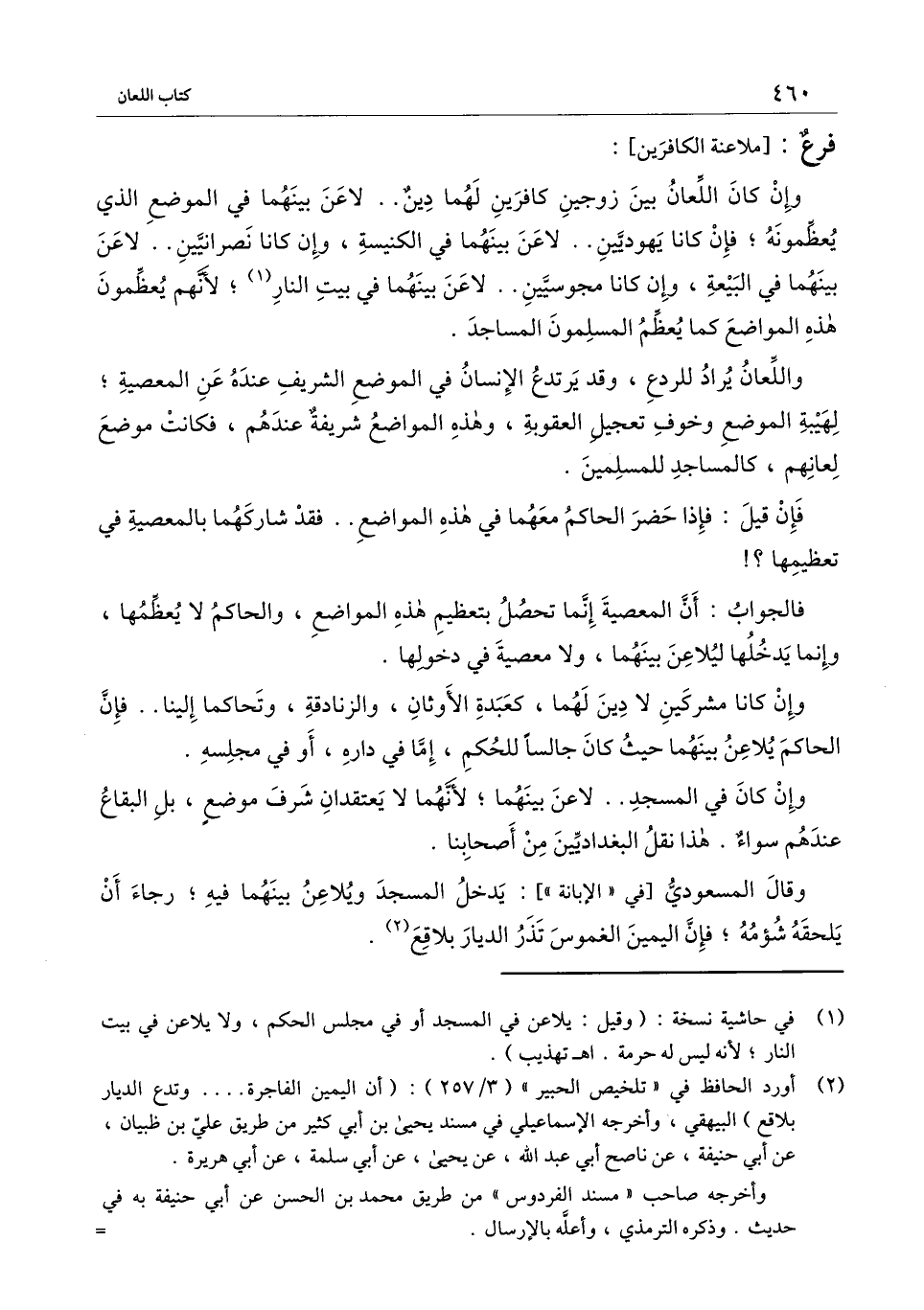 ] : وإن كان اللعان بين زوجين كافرين لهما دين.. لاعن بينهما في الموضع الذي يعظمونه؛ فإن كانا يهوديين.. لاعن بينهما في الكنيسة، وإن كانا نصرانيين.. لاعن بينهما في البيعة، وإن كانا مجوسيين.. لاعن بينهما في بيت النار؛ لأنهم يعظمون هذه المواضع كما يعظم المسلمون المساجد.
