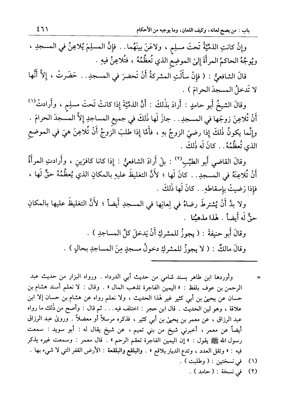 وقال القاضي أبو الطيب: بل أراد الشافعي: إذا كانا كافرين، وأرادت المرأة أن تلاعنه في المسجد.. كان لها؛ لأن التغليظ عليه بالمكان الذي يعظمه حق لها، فإذا رضيت بإسقاطه.. كان لها ذلك.