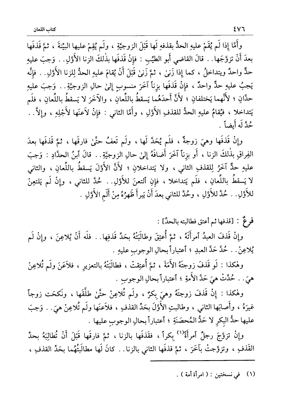 وهكذا: لو قذف زوجته الأمة، ثم أعتقت، فطالبته بالتعزيز، فلاعن ولم تلاعن هي.. حدت هي حد الأمة؛ اعتبارا بحال الوجوب.