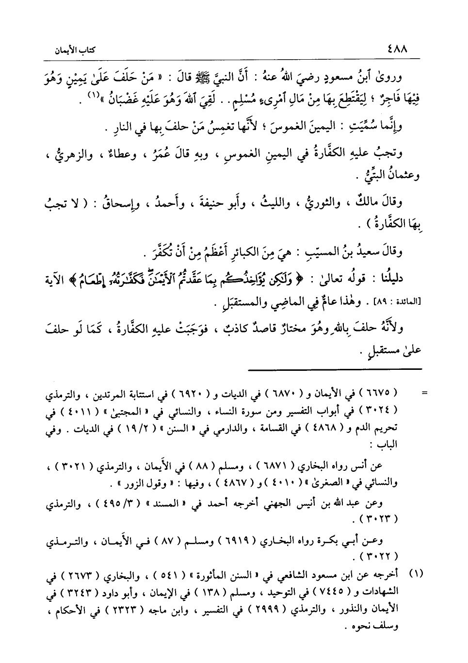 وروى ابن مسعود - رَضِيَ اللَّهُ عَنْهُ -: أن النبي - صَلَّى اللَّهُ عَلَيْهِ وَسَلَّمَ - قال: «من حلف على يمين وهو فيها فاجر؛ ليقتطع بها من مال امرئ مسلم.. لقي الله وهو عليه غضبان» .
