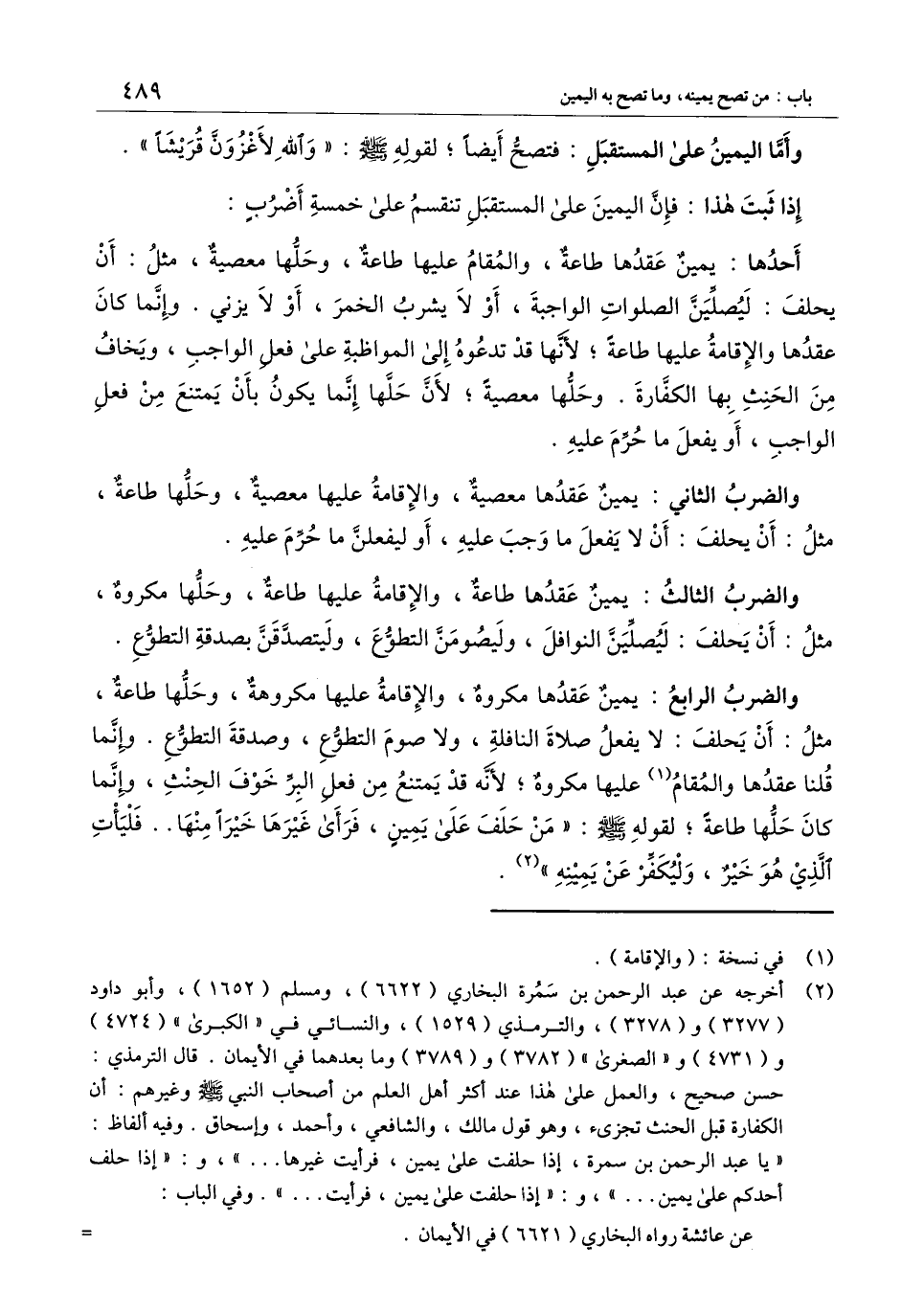 والضرب الرابع: يمين عقدها مكروه، والإقامة عليها مكروهة، وحلها طاعة، مثل: أن يحلف: لا يفعل صلاة النافلة، ولا صوم التطوع، وصدقة التطوع. وإنما قلنا عقدها والمقام عليها مكروه؛ لأنه قد يمتنع من فعل البر خوف الحنث، وإنما كان حلها طاعة؛ لقوله - صَلَّى اللَّهُ عَلَيْهِ وَسَلَّمَ -: «من حلف على يمين، فرأى غيرها خيرا منها.. فليأت الذي هو خير، وليكفر عن يمينه» .