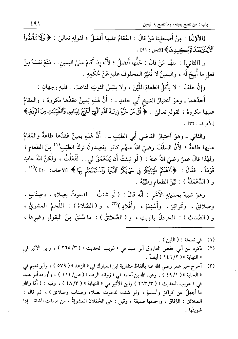 الثاني - وهو اختيار القاضي أبي الطيب -: أن هذه يمين عقدها طاعة والمقام عليها طاعة؛ لأن السلف - رَضِيَ اللَّهُ عَنْهُمْ - كانوا يقصدون ترك الطيب من الطعام؛ ولهذا قال عمر - رَضِيَ اللَّهُ عَنْهُ -: (لو شئت أن يدهمق لي.. لفعلت، ولكن الله عاب قوما، فقال: {أَذْهَبْتُمْ طَيِّبَاتِكُمْ فِي حَيَاتِكُمُ الدُّنْيَا وَاسْتَمْتَعْتُمْ بِهَا} [الأحقاف: 20] [الأحقاف: 20] ) . و (الدهمقة) : لين الطعام وطيبه.