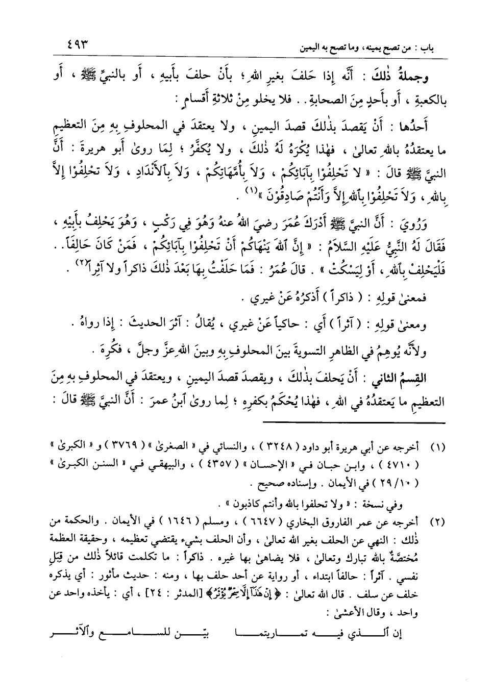 وروي «أن النبي - صَلَّى اللَّهُ عَلَيْهِ وَسَلَّمَ - أدرك عمر - رَضِيَ اللَّهُ عَنْهُ - وهو في ركب، وهو يحلف بأبيه، فقال له النبي - عَلَيْهِ السَّلَامُ -: " إن الله ينهاكم أن تحلفوا بآبائكم، فمن كان حالفا.. فليحلف بالله، أو ليسكت ". قال عمر: فما حلفت بها بعد ذلك ذاكرا ولا آثرا» .