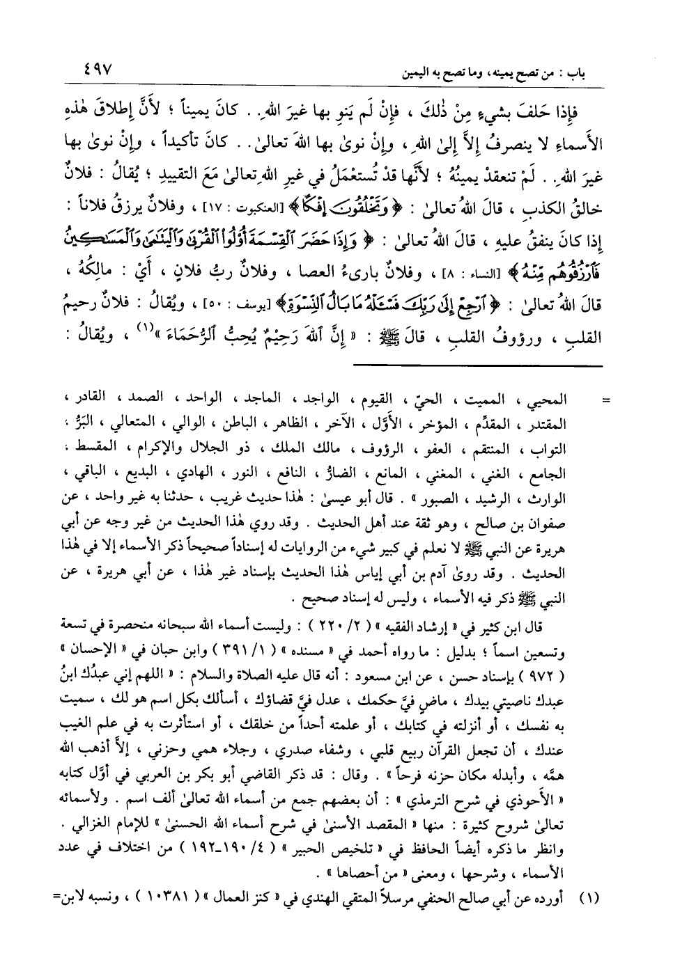 فإذا حلف بشيء من ذلك، فإن لم ينو بها غير الله.. كان يمينا؛ لأن إطلاق هذه الأسماء لا ينصرف إلا إلى الله، وإن نوى بها الله تعالى.. كان تأكيدا، وإن نوى بها غير الله.. لم تنعقد يمينه؛ لأنها قد تستعمل في غير الله تعالى مع التقييد؛ يقال: فلان خالق الكذب، قال الله تعالى: {وَتَخْلُقُونَ إِفْكًا} [العنكبوت: 17] [العنكبوت: 17] ، وفلان يرزق فلانا: إذا كان ينفق عليه، قال الله تعالى: {وَإِذَا حَضَرَ الْقِسْمَةَ أُولُو الْقُرْبَى وَالْيَتَامَى وَالْمَسَاكِينُ فَارْزُقُوهُمْ مِنْهُ} [النساء: 8] [النساء: 8] ، وفلان بارئ العصا، وفلان رب فلان، أي: مالكه، قال الله تعالى: {ارْجِعْ إِلَى رَبِّكَ فَاسْأَلْهُ مَا بَالُ النِّسْوَةِ} [يوسف: 50] [يوسف: 50] ، ويقال: فلان رحيم القلب، ورؤوف القلب، قال - صَلَّى اللَّهُ عَلَيْهِ وَسَلَّمَ -: " إن الله رحيم يحب الرحماء "، ويقال: