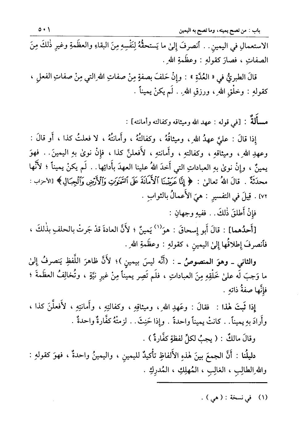 ] : إذا قال: علي عهد الله، وميثاقه، وكفالته، وأمانته، لا فعلت كذا، أو قال: وعهد الله، وميثاقه، وكفالته، وأمانته، لأفعلن كذا، فإن نوى به اليمين.. فهو يمين، وإن نوى به العبادات التي أخذ الله علينا العهد بأدائها.. لم يكن يمينا؛ لأنها محدثة، قال الله تعالى: {إِنَّا عَرَضْنَا الأَمَانَةَ عَلَى السَّمَاوَاتِ وَالأَرْضِ وَالْجِبَالِ} [الأحزاب: 72] [الأحزاب: 72] . قيل في التفسير: هي الأعمال بالثواب.