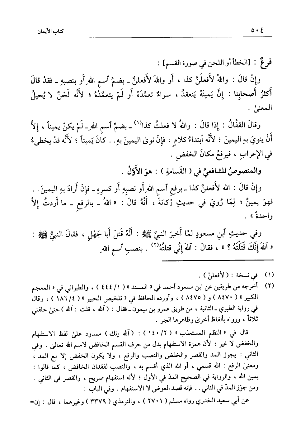 وفي «حديث ابن مسعود لما أخبر النبي - صَلَّى اللَّهُ عَلَيْهِ وَسَلَّمَ -: أنه قتل أبا جهل، فقال النبي - صَلَّى اللَّهُ عَلَيْهِ وَسَلَّمَ -: " آلله إنك قتلته؟ "، فقال: آلله إني قتلته. بنصب اسم الله» .