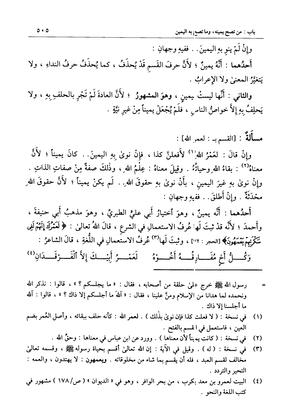 ] : وإن قال: لعمر الله لأفعلن كذا، فإن نوى به اليمين.. كان يمينا؛ لأن معناه: بقاء الله وحياته. وقيل معناه: علم الله، وذلك صفة من صفات الذات. وإن نوى به غير اليمين، بأن نوى به حقوق الله.. لم يكن يمينا؛ لأن حقوق الله محدثة. وإن أطلق.. ففيه وجهان: