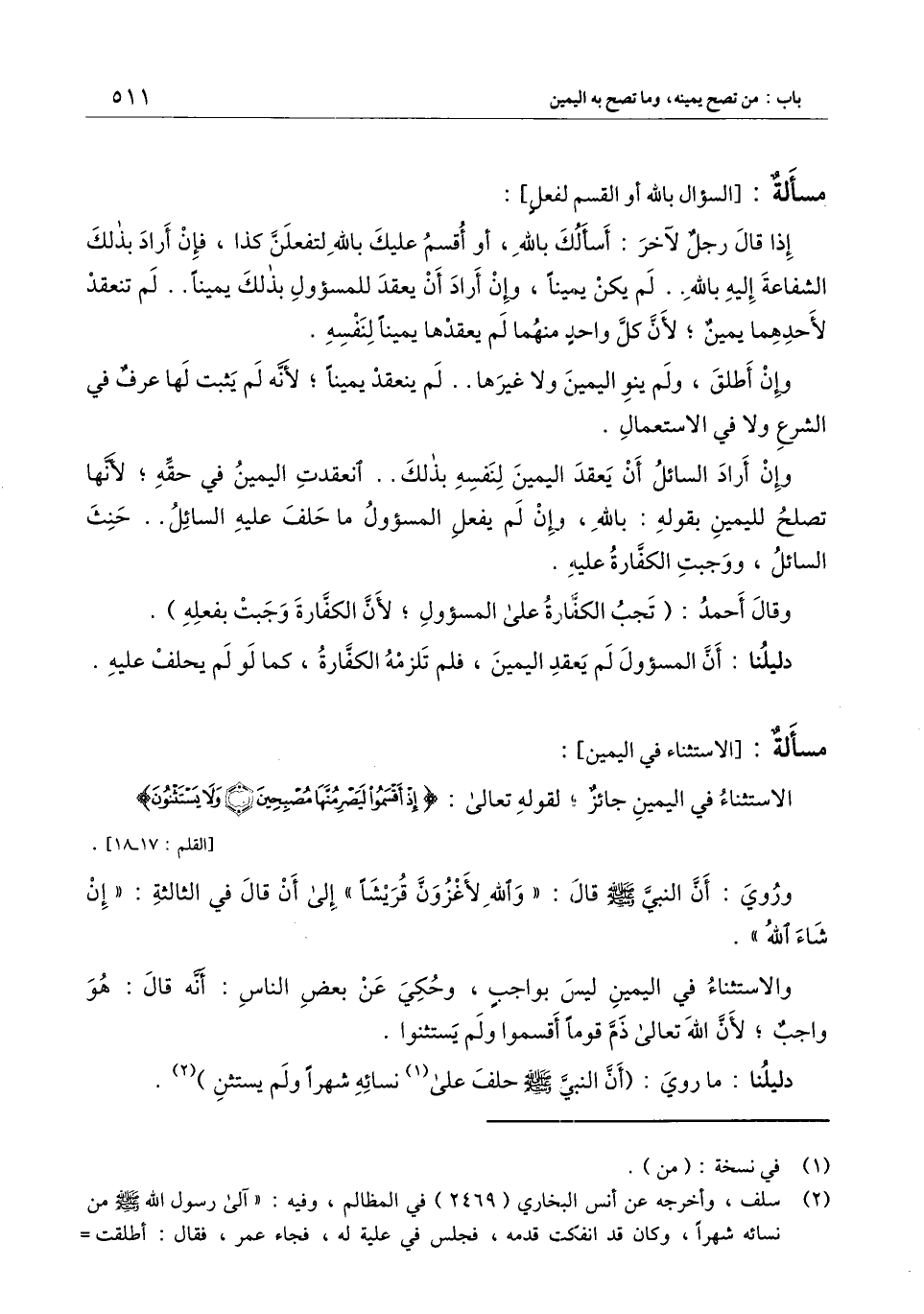 ] : الاستثناء في اليمين جائز؛ لِقَوْلِهِ تَعَالَى: {إِذْ أَقْسَمُوا لَيَصْرِمُنَّهَا مُصْبِحِينَ} [القلم: 17] {وَلا يَسْتَثْنُونَ} [القلم: 18] [القلم: 17 - 18] .